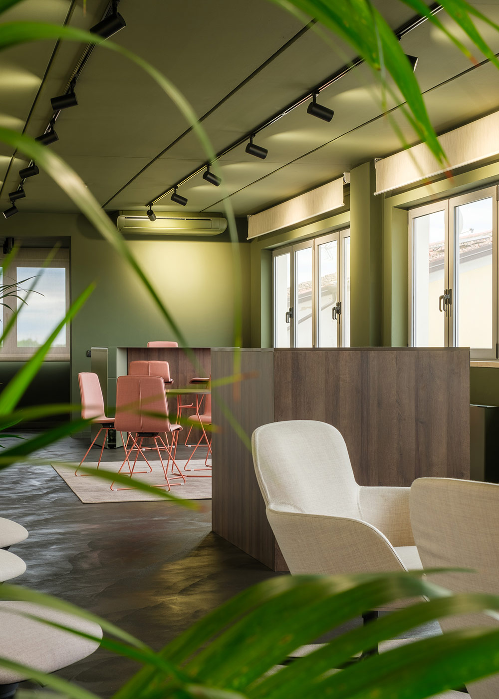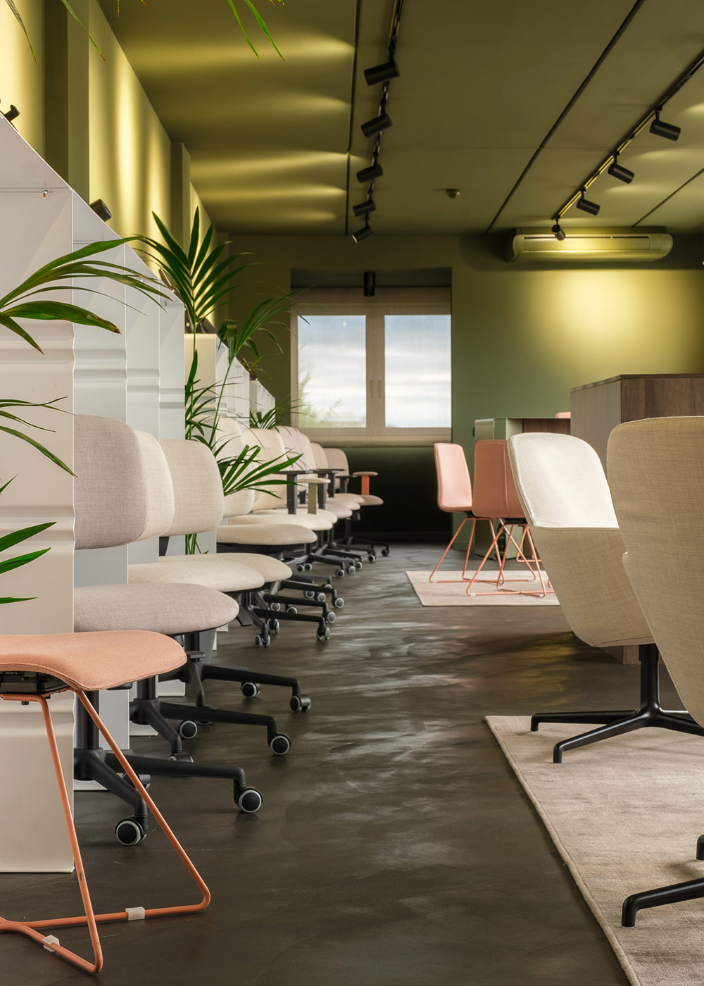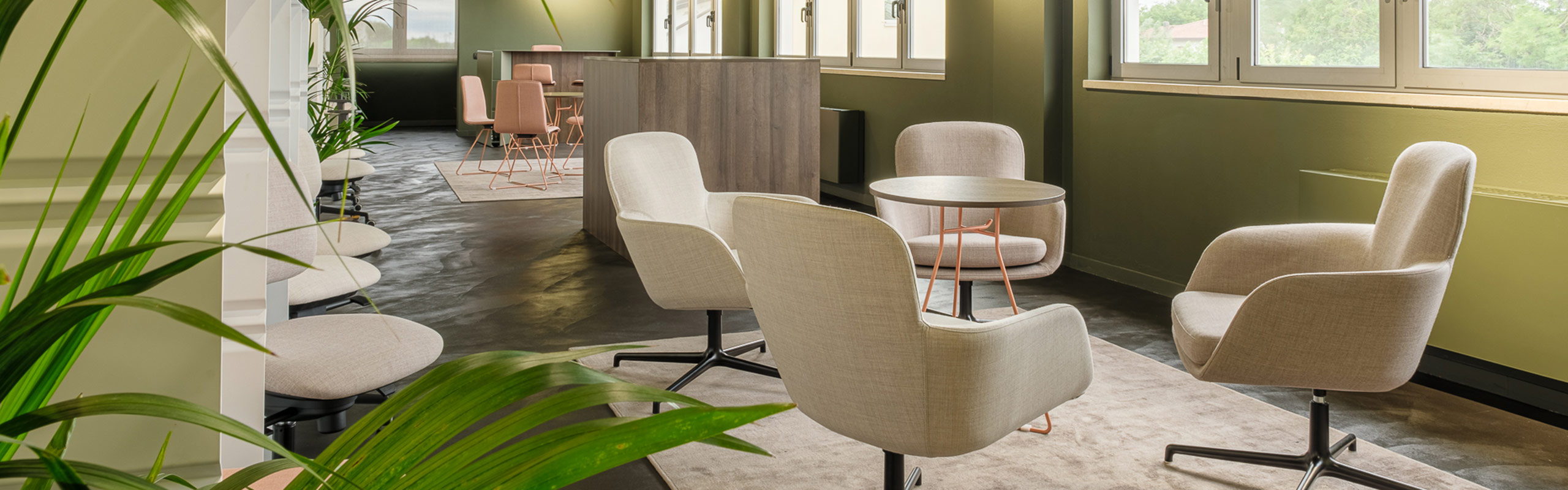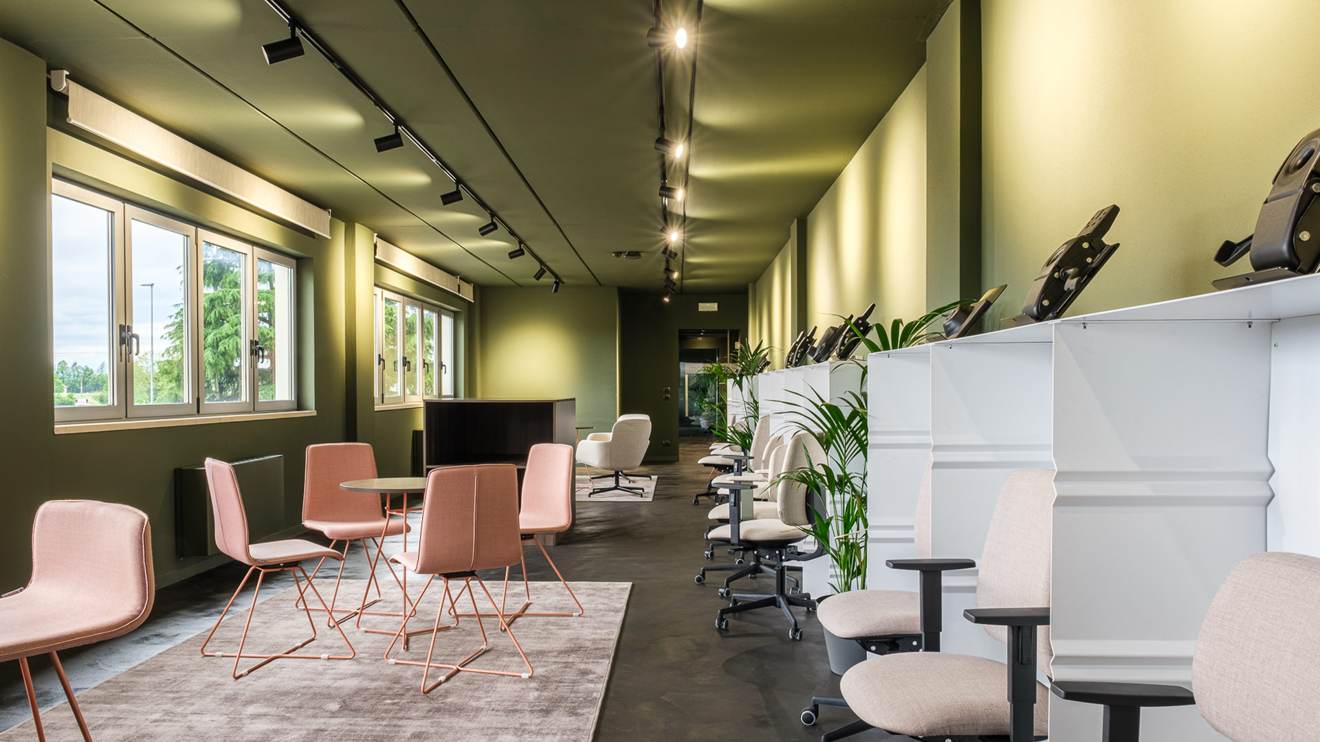 Il nostro showroom è un ambiente unico che combina toni verdi freschi e dettagli naturali, creando uno spazio accogliente e stimolante. Questa atmosfera naturale si riflette nelle nostre soluzioni pratiche e confortevoli, progettate per offrire un’esperienza di comfort in ogni spazio di applicazione.